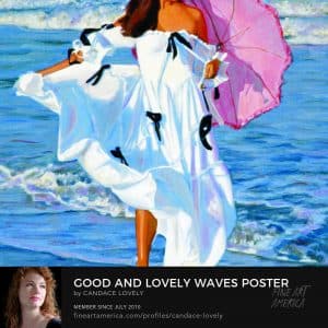 This piece has been called “a pleasurable experience of oneself reflected in nature,” both figuratively and literally as we see the subject duplicated in the glassy surf. The artist’s intention was to create a piece in line with her Good and Lovely collection, centered around elements of attraction and a palette of pink, black, and white in line with the original candy brand. Lovely not only incorporates this obviously in the black bows, white dress, and pink parasol, but with the same vivid hues woven into the colorful highlights in the waves, the white fabric, and prismatically angling from horizon into sky. Delivered here in Lovely’s characteristic voyeuristic composition, this painting is the prelude to Good and Lovely Sandy Toes.